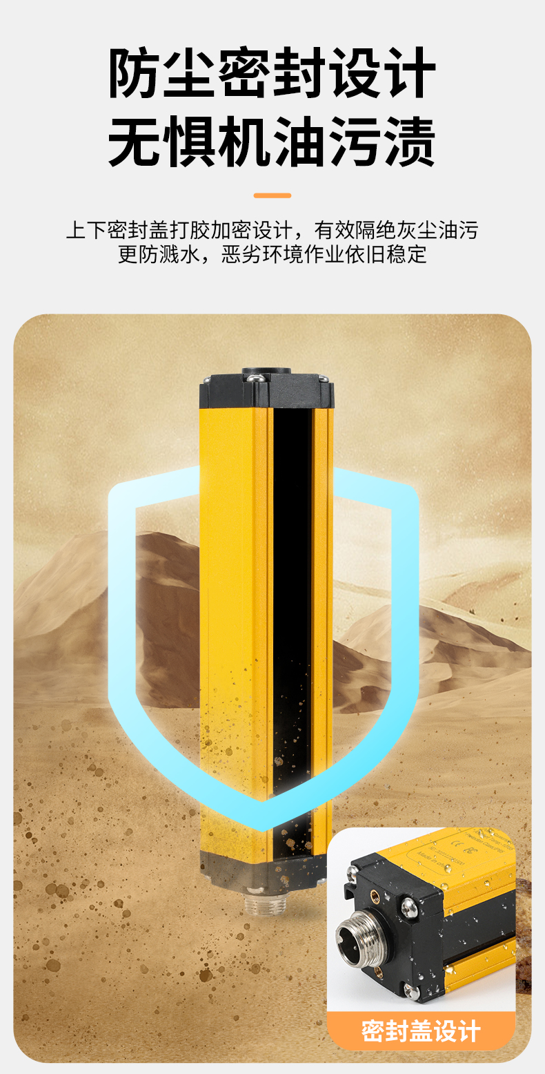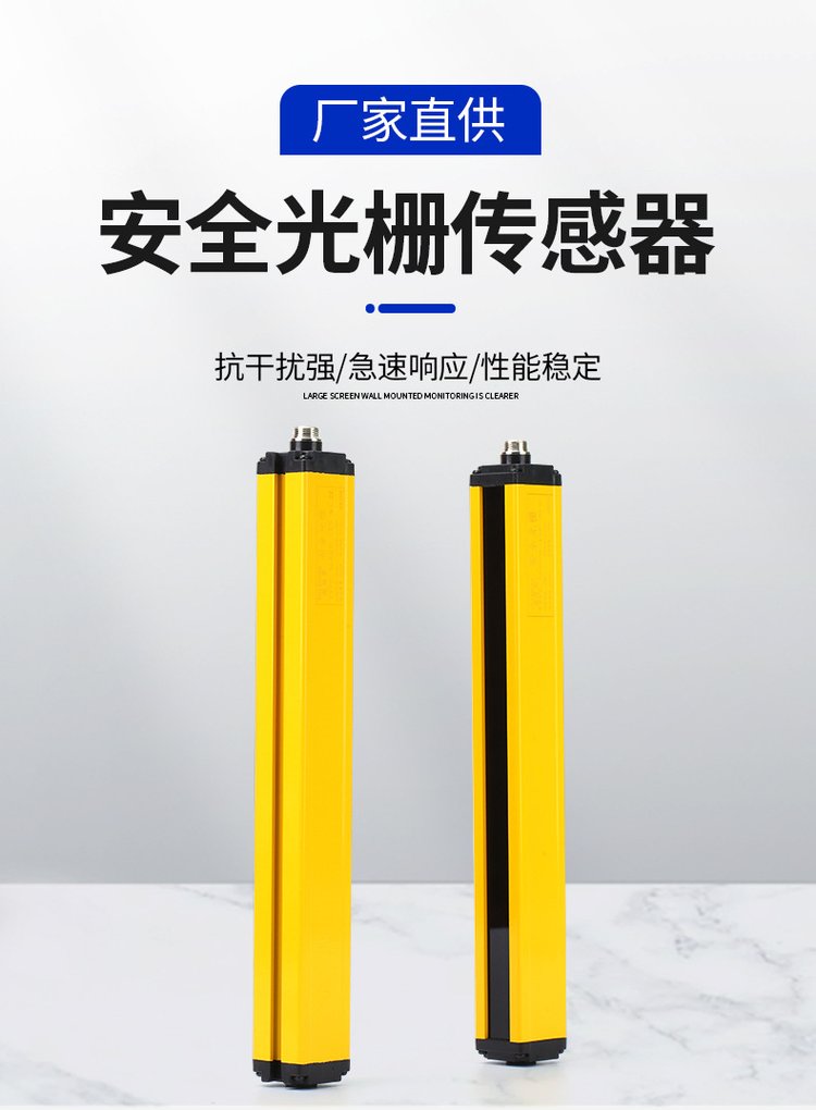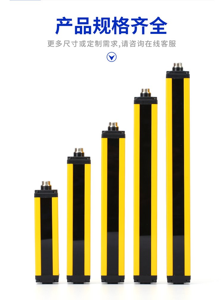 安全光幕等,主要用于機械加工設備、危險工作區域,防止機械設備對操作者的傷害和誤入危險區域造成的人身傷害,保護人身安全。對于滑塊能在行程的任意位置制動停止的壓力機,可實現全程保護;或與凸輪開關配合,實現 30°~ 180°之間行程的保護。
