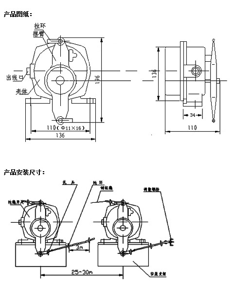 開關間最大距離:40米(水平)、30米(傾斜)、每3米鋼絲繩有一托環支撐。